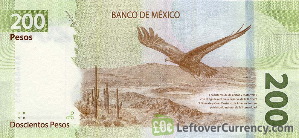 - Text: 200, 200 Pesos, Banco de Mexico, BM, CIUDAD DE MÉXICO, 26 NOV. 2018, Doscientos Pesos, Ecosistema de desiertos y matorrales, con el águila real en la Reserva de la Bíosfera El Pinacate y Gran Desierto de Altar en Sonora, patrimonio natural de la humanidad., Miguel Hidalgo y Costilla y José Maria Morelos y Pavón, héroes de la Independencia de México.