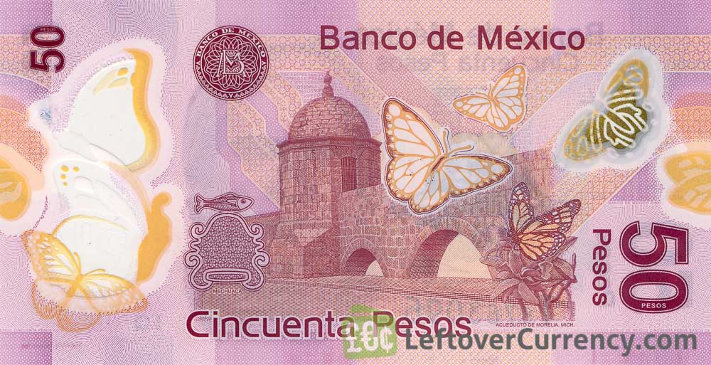 This newer $50 pesos banknote has the same artwork as the note it replaced, but with enhanced security measures. The most distinctive difference is the gold foil butterfly on the front left of the note, and the butterfly window feature that are unique to this note.