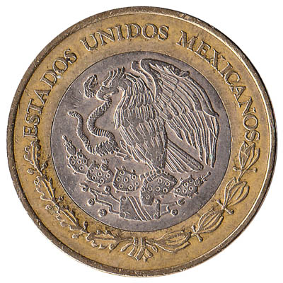 This 10 Mexican peso coin is the largest, heaviest and highest value coin in circulation in Mexico today. Unlike the other Mexican bimetallic coins, the $10 coin’s outer ring is made of aluminium bronze. It has a silver coloured centre made from copper-nickel-zinc. On one side there is the Mexican national arms. The design on the reverse represents the sun god Tonatiuh, taken from the Piedra del Sol or Sun Stone, housed in Mexico City.