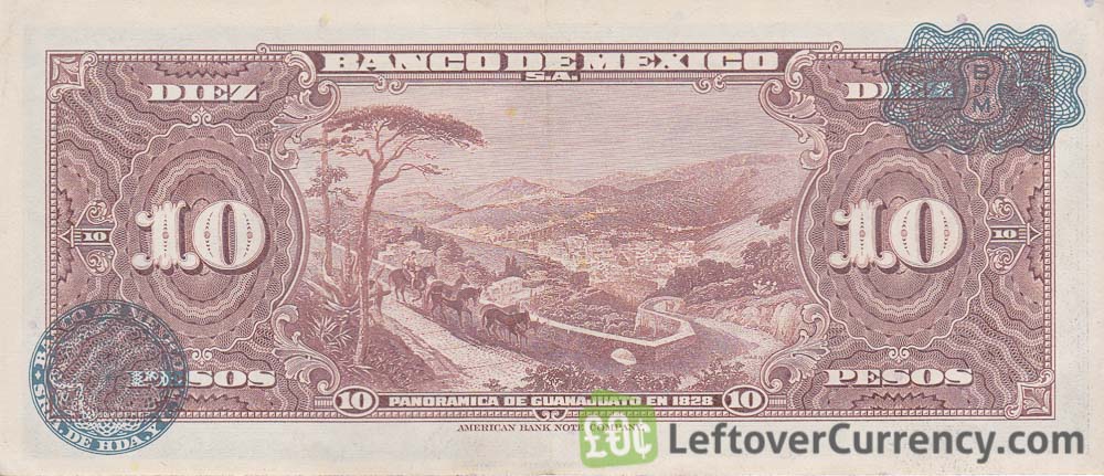 The Bank of Mexico issued Mexican Peso banknotes in 15 different denominations, including this 10 old Mexican Pesos banknote (la Tehuana). They are part of the obsolete Old Mexican Peso banknotes series. The Bank of Mexico started issuing these 10 Mexican Peso banknotes in 1937. They were withdrawn from circulation in 1969.