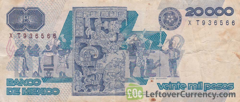 The $20,000 Mexican Pesos banknote shows the portrait of statesman Andrés Quintana Roo. In addition, the Veinte Mil Pesos bill features important archeological Maya sites: Tulum on the front side, and the murals of Bonampak and Yaxchilan on the back side. The blue-coloured $20,000 Pesos bill was replaced by a similarly designed banknote of 20 New Mexican Pesos in 1993, dropping three zeroes.
