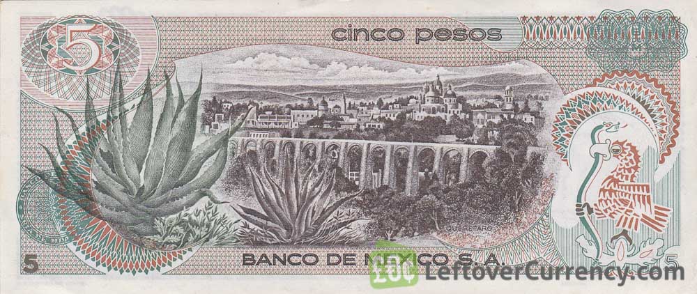The banknote of $5 old Mexican Pesos from 1971 has the portrait of heroine of Mexico’s independence movement Josefa Ortiz de Domínguez, also known as La Corregidora. The back side shows a view on the aqueduct of Querétaro City, consisting of seventy four arches.