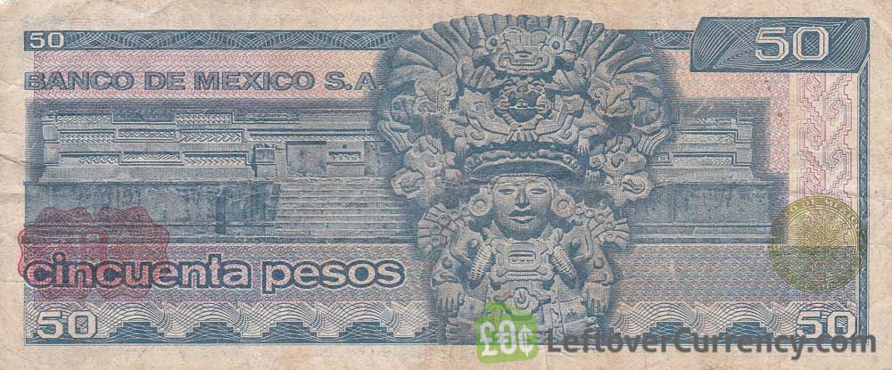The blue-coloured banknote of $50 old Mexican Pesos has the portrait of Benito Juárez on the front side, with on the background the National Palace in Mexico City. On the back side is an image of the Zapotec archeological site Mitla in Oaxaca.