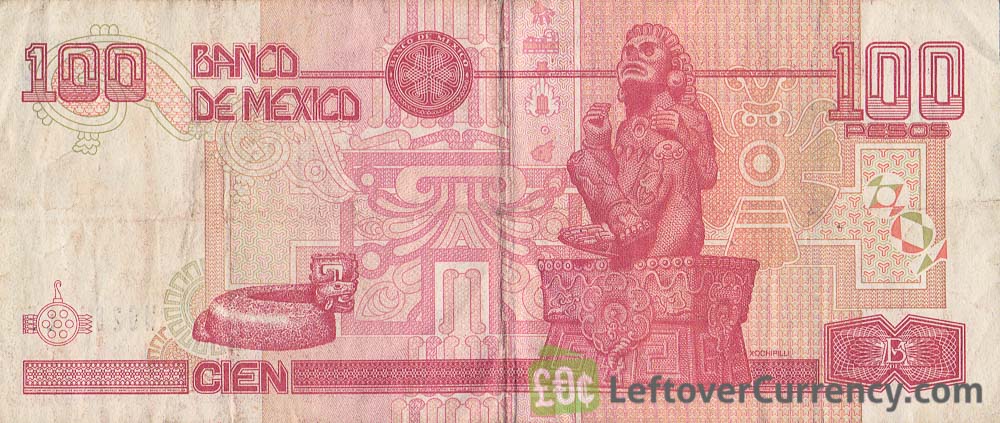 The 100 Mexican Pesos banknote from Series D features the 15th Century ruler and warrior Nezahualcoyotl on the front, and a statue of the Aztec god Xochipilli on the reverse. The red/rose coloured $100 MXN banknote from Series D was replaced by a more modern banknote with improved security features but a similar design.