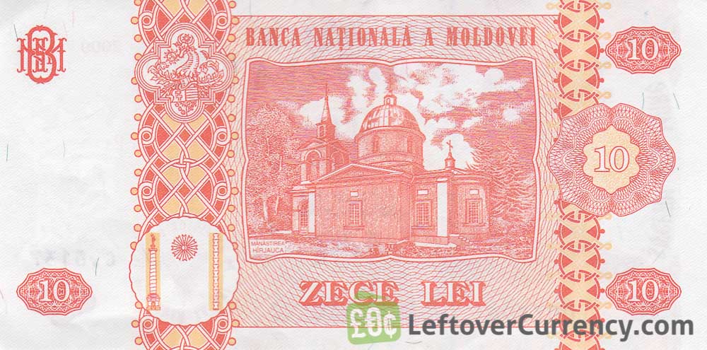 The Moldovan coat of arms with eagle and aurochs, along with a portrait of Prince Ștefan cel Mare of Moldavia are shown on the front side of this red coloured banknote of 10 Zece Lei. The back side of the 10 MDL bill shows an image of Harjauca Monastery.