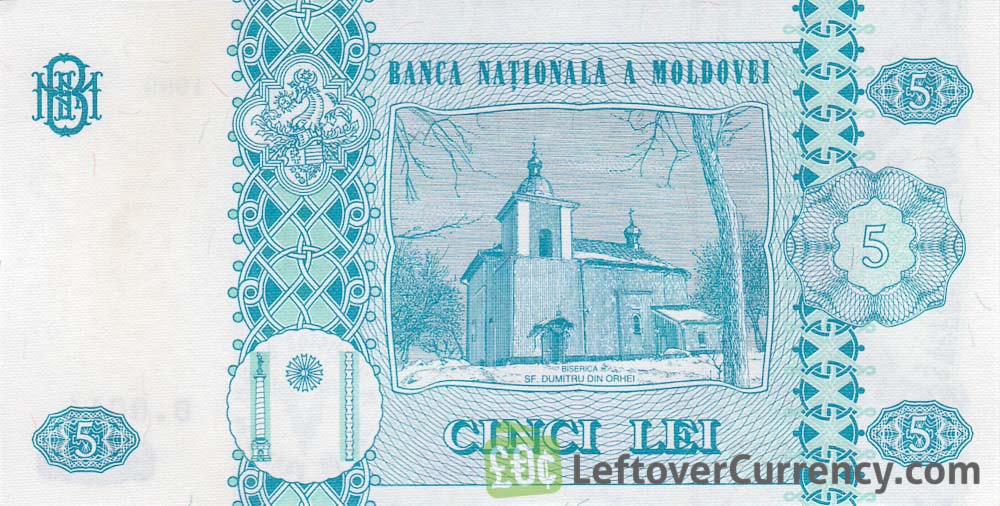 The blue-coloured 5 Lei bill from Moldova has the portrait of Stephen the Great of Moldavia on the front side. The back side of the 5 MDL bill features an image of St. Dumitru Church in Orhei.
