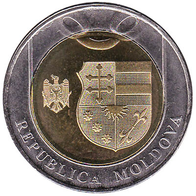 Moldova introduced a new set of coins in 2018. This bimetallic 10 lei piece is the highest value coin in Moldova. Its design features the natioan coat of arms and elements from the Moldovan flag, including an auroch’s head and an eagle holding an Orthodox Christian cross in its beak.