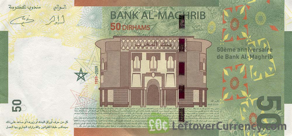 The Bank Al-Maghrib issued Moroccan Dirham banknotes in 6 different denominations, including this 50 Moroccan Dirhams banknote (2009 commemorative issue). They are part of the current Moroccan Dirham banknotes series. The Bank Al-Maghrib started issuing these 50 Moroccan Dirham banknotes in 2009. They are currently still in circulation.
