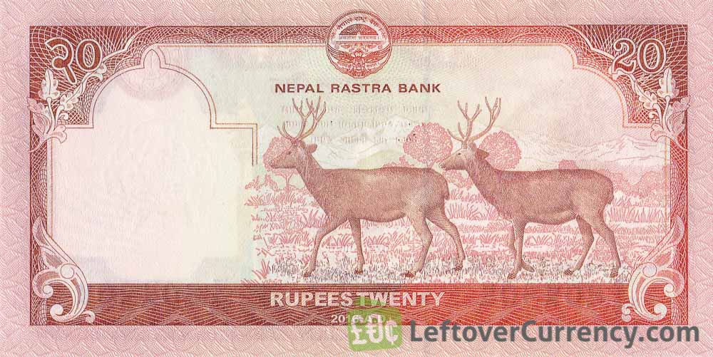 The 20 Rupees banknote from Nepal features Krishna Mandir temple and Mount Everest in the Himalayas. Krishna Mandir is a 17th century multi-storey Hindu temple in Patan Durbar Square, Lalitpur. On the back side of the 20 NPR bill is the text ‘Rupees Twenty” and the image of two swamp deer, also known as barasingha.