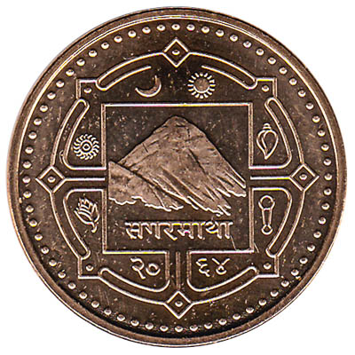On the obverse side of this Re.1 coin is an illustration of the famous Mount Everest, the peak of which is located in Nepal. The reverse side shows a map of Nepal in the center of the coin with mountains above.