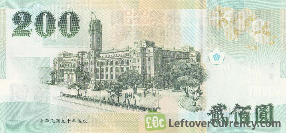 The 200 yuan or new Taiwan dollar note shows a seated Chiang Kai-shek, the leader of the Kuomintang from 1928 until his death in 1975. The reverse of this Taiwanese banknote depicts the Presidential Office building in the Zhongzheng district of Taipei.