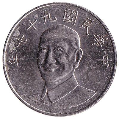 This 10 yuan/New Taiwan dollar coin depicts Chiang Kai-shek, who was the leader of the Chinese Republic from 1928 until 1975. The 10 TWD piece weighs 7.5 grams and has a diameter of 26mm.