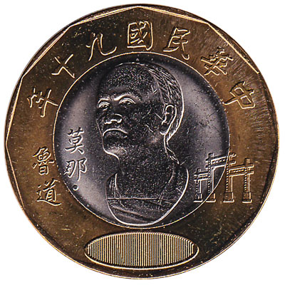 The bi-metallic 20 Taiwan dollar coin depicts Mona Rudao, the Seediq tribal chief who led a revolt against the Japanese occupational forces in Taiwan 1930.