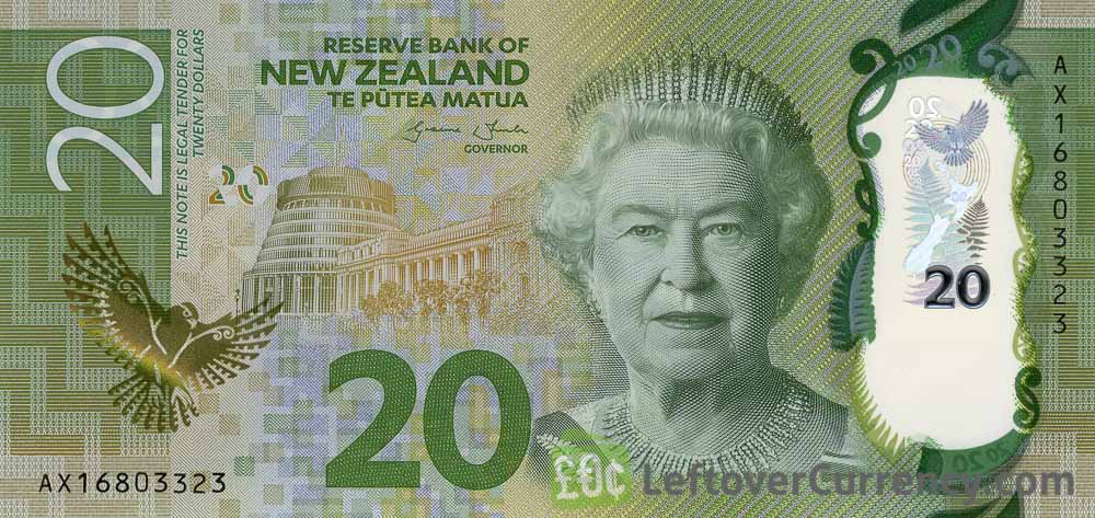 The green colored $20 New Zealand dollar note has a portrait of HM Queen Elizabeth II on the front side, with in the background the New Zealand Parliament buildings in Wellington. The reverse side features a falcon. The text on the twenty NZD polymer note is both in English and Maori.