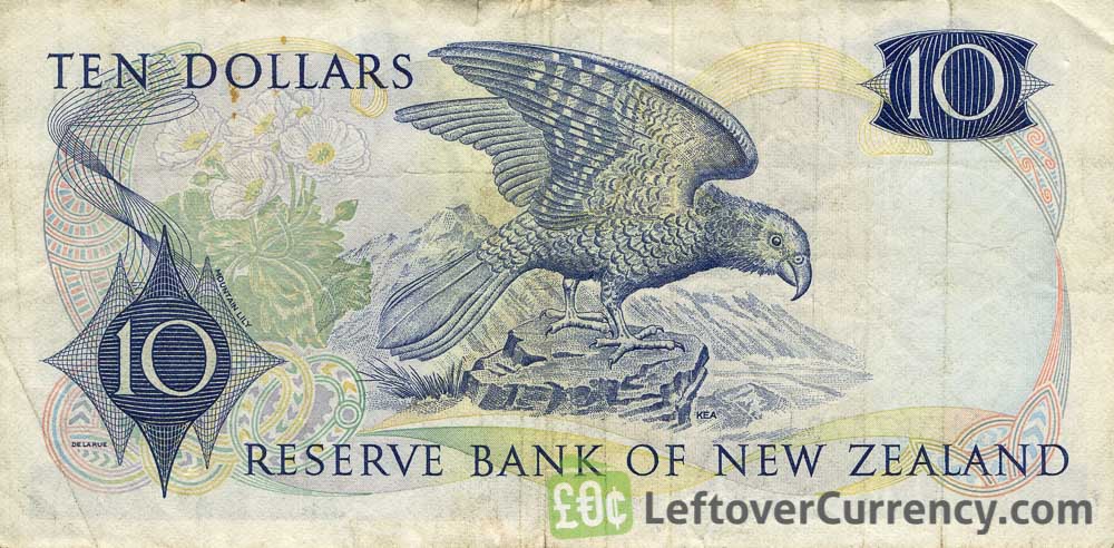 This blue colored ten dollars bill depicts Her Majesty Queen Elizabeth II. Text on the paper currency note reads ‘Reserve Bank of New Zealand’. The bird on the back of the old $10 NZD bill is a kea.
