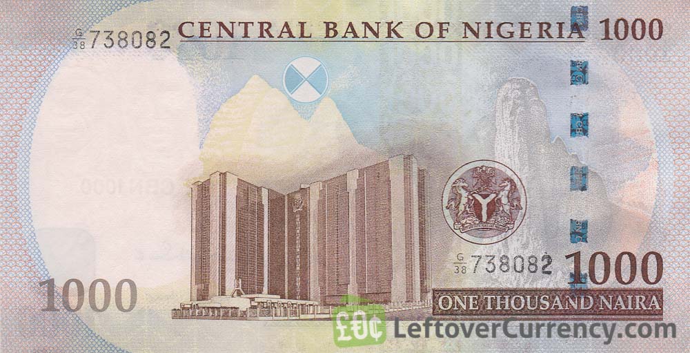 The 1000 Naira banknote is the highest value paper money note in Nigeria. On the obverse side of the ₦1000 bill are the portraits of Mallam Alijy Mai-Bornu and Dr Clement Nyong Isong. Both men are governors: the former of the Central Bank of Nigeria and the latter of Cross River State, South Nigeria. The building on the reverse side of the 1000 NGN banknote is the Central Bank of Nigeria’s Headquarters in Abuja, the capital city of Nigeria.