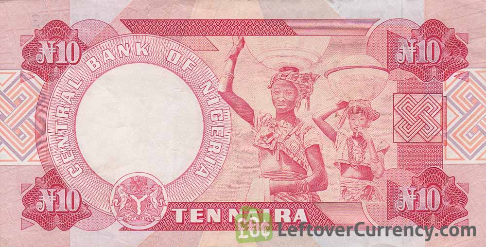The 1984 version of the red and orange-coloured paper banknote of 10 Nigerian Naira pictures Alvan Ikoku on the front side. The back side of the withdrawn 10 NGN bill shows two Nigerian women with bowls on their heads. A white circle is on both sides of the note, surrounding the note’s watermark, a heraldic eagle. The 1984 version was issued for many years. First undated and later including the year of issue on the front side: 2001, 2002, 2003, 2004 or 2005. Undated banknotes are from between 1984 and 2000.
