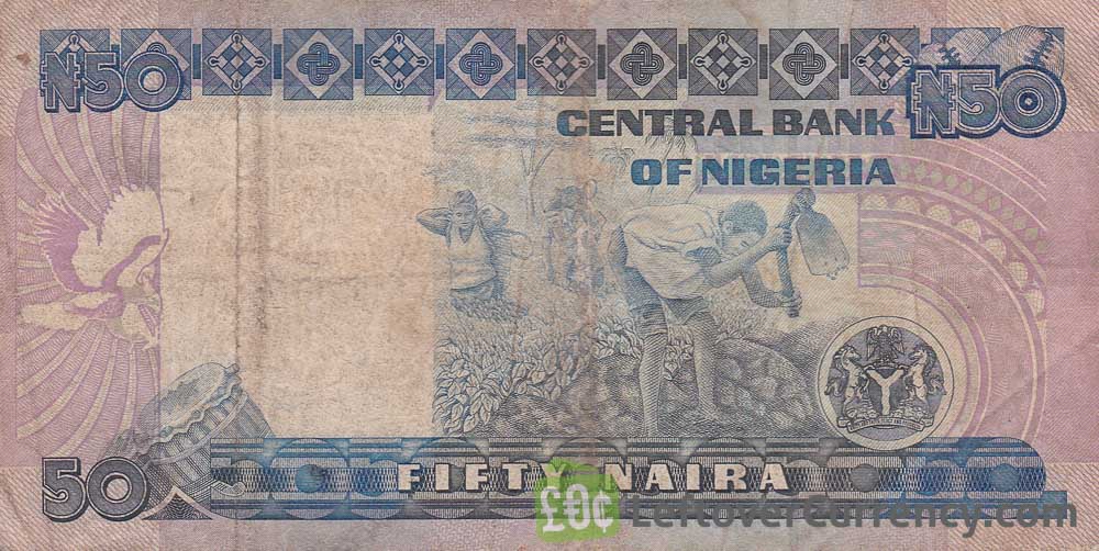 The Central Bank of Nigeria issued Nigerian Naira banknotes in 5 different denominations, including this 50 Nigerian Naira paper banknote (Better Life). They are part of the withdrawn Nigerian Naira banknotes series. The Central Bank of Nigeria started issuing these 50 Nigerian Naira banknotes in 1991. They were withdrawn from circulation in 2009.