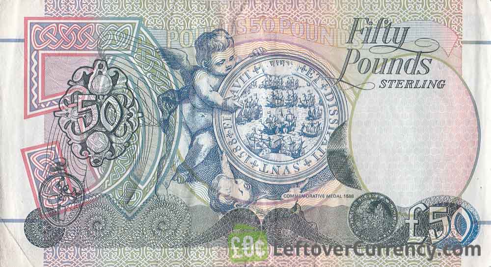 This fifty pounds sterling banknote is 156mm wide by 85mm high. It features an elderly man. Printed on the paper banknote is the text ‘First Trust Bank’. On the backside of the olive-green colored £50 note are cherubs holiding an Armada medallion.