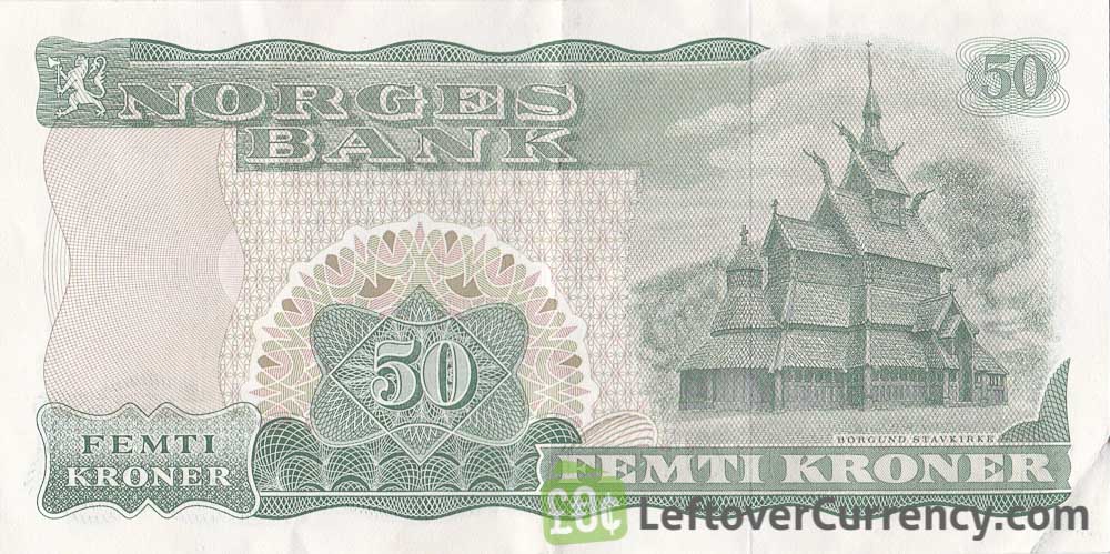 The 50 kroner banknote features the portrait of Norwegian author Bjørnstjerne Björnson on the front side. The reverse side of this green colored Femti Kroner bill features a wooden stave church in Borgund.