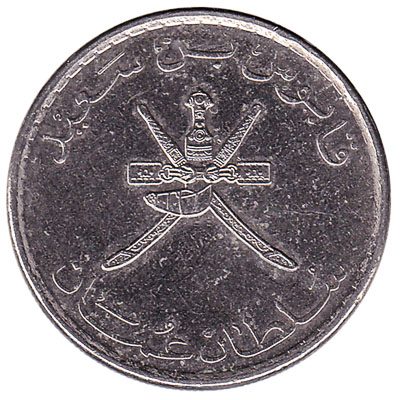 The 50 baisa coin from Oman has a value equivalent to 0.05 rial. That is because there are 1000 baisa in one rial. This 50 baisa coin shows Oman’s national arms, the Khanjar Bo Sayfain, on its obverse side with the Sultan’s name above. The name of the Sultan displayed is either ‘Haitham bin Tariq’ on modern coins or ‘Qaboos bin Said’ on older coins from before 1999.