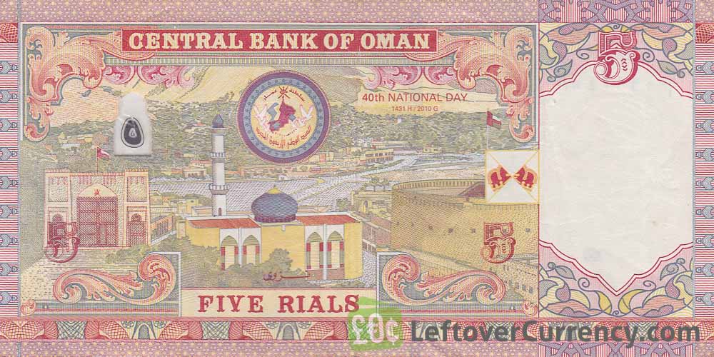 The 5 Rials banknote was issued on the 40th National Day of Oman in the Islamic year 1431 (2010 AD). The Five Rials bill features the portrait of Sultan Baqoor of Oman and a panoramic view on Nizwa City.