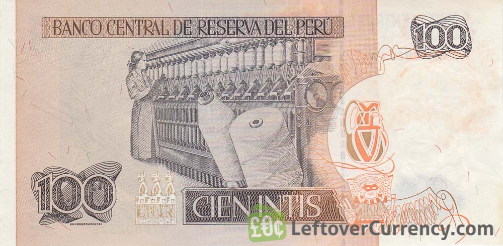 The Banco Central de Reserva del Perú issued Peruvian Sol banknotes in 12 different denominations, including this 100 Peruvian intis banknote. They are part of the demonetized Peruvian Inti banknotes series. The Banco Central de Reserva del Perú started issuing these 100 Peruvian Sol banknotes in 1985. They were withdrawn from circulation in 1991.