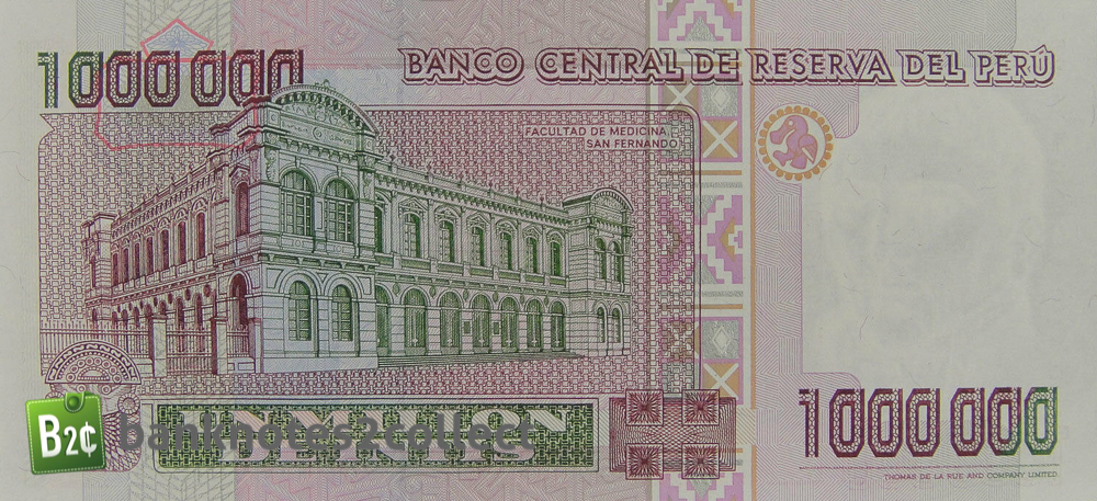 The 1 Million Peruvian Intis banknote features the portrait of minister Hipolito Unanue on the front side. The back side of the Un Milion De Intis bill has an image of the San Fernando Medical college in Lima.