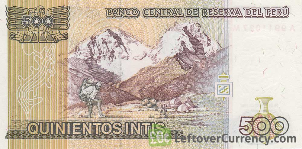 The 500 Peruvian intis banknote features revolutionary leader of the Andean uprising against the Spanish in Peru, Túpac Amaru II. On the back of the Quinientos Intis bill is a view on the Andes Mountains with a climber.