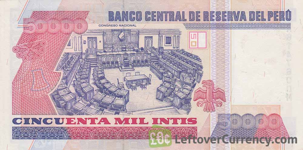Peru’s 50,000 Intis banknote has the portrait of author and politician Víctor Raúl Haya de la Torre on the front side. The back side of the Cincuenta Mil Intis bill shows the Congreso Nacional, Peru’s Parliament in the Peruvian capital Lima.
