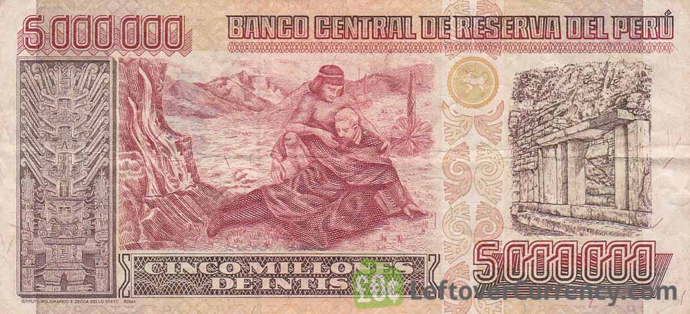 The Banco Central de Reserva del Perú issued Peruvian Sol banknotes in 12 different denominations, including this 5,000,000 Peruvian intis banknote. They are part of the demonetized Peruvian Inti banknotes series. The Banco Central de Reserva del Perú started issuing these 5000000 Peruvian Sol banknotes in 1990. They were withdrawn from circulation in 1991.