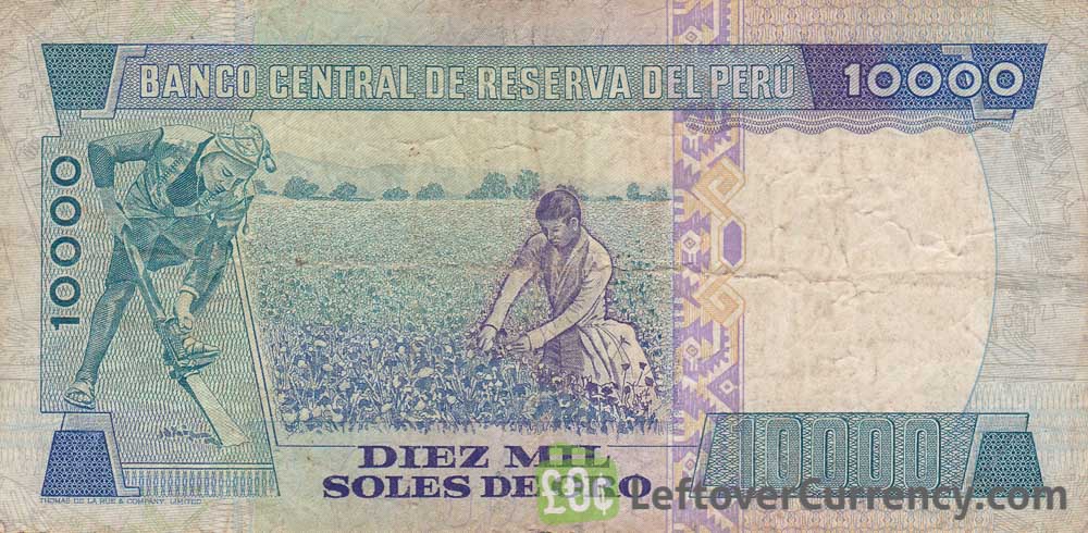The Peruvian writer and chronicler El Inca, full name Inca Garcilaso de la Vega, is portrayed on the bill of 10,000 Soles de Oro. On the back of the diez mil soles de oro banknote are two farmers at work.