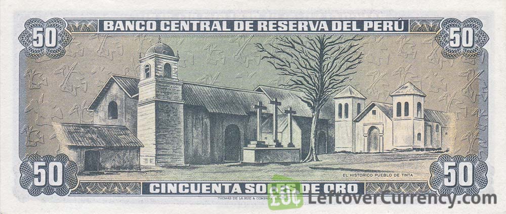 The banknote of 50 soles de oro from Peru features the revolutionary leader Tupac Amaru II who fought the Spanish conquistadors in the Andes Mountains. The back side of the cincuenta soles de oro bill shows the historic town of Tinta in the region of Cusco, where the Rebellion of Túpac Amaru II started in 1780.