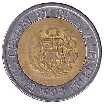 The Banco Central de Reserva del Perú issued Peruvian Sol coins in 8 different denominations, including this 5 Peruvian Nuevos Soles coin. They are part of the Peruvian Sol coins series. The Banco Central de Reserva del Perú started issuing these 5 Peruvian Sol coins in 1994. They are currently still in circulation.