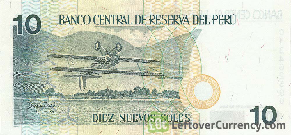 The 10 Peruvian Nuevos Soles banknote from the monetary reform issue pictures the Peruvian national hero, aviator José Abelardo Quiñones Gonzales. The pilot’s plane, a North-American NA-50 ‘Torito’ (Little bull), is shown flying upside down on the back side of the green coloured Diez Nuevos Soles banknote.