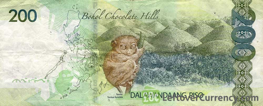 The bill of dalawandaang piso is 160mm wide by 66mm high. On the green-colored paper currency note a caption reads ‘Republika Ng Pilipinas’. On the front of the ₱200 note is an image of Diosdado P. Macapagal, former Filipino president . On the backside are Bohol Chocolate Hills and a tarsier.