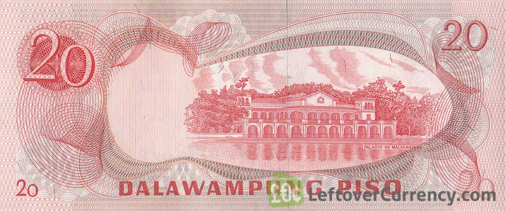 The orange-blue colored note of twenty pisos features president Manuel Luis Quezon on the front side and Malakanyang Palace in Manilla on the back.