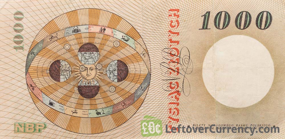 The 1965 dated banknote of 1000 Polish Zlotych shows the head of Nicolaus Copernicus in a circle. The Polish astronomer Copernicus formulated the theory of the Heliocentric universe. The back of the old 1000 PLZ banknote shows a diagram of a heliocentric system, with Earth rotating around the Sun.