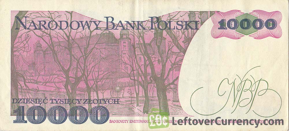The banknote of 10,000 zlotych has a portrait of Polish poet and playwright Stanislaw Poniatowski on the obverse side. The reverse side features the Planty Park around the old town of Krakow. The 10,000 old zlotych note was replaced by a coin of 1 new zloty in 1995. In that year, the New Polish Zloty was introduced as Poland’s new currency, replacing the old Polish zloty at a rate of 10,000 old zlotych for 1 new zloty.