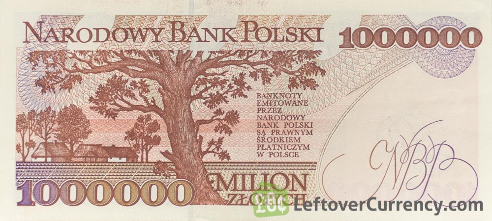 Wladyslaw Reymont, Laureate of the Nobel Prize for Literature, is portrayed on the banknote of 1 Million old Polish Zlotych. The reverse side of the 1,000,000 PLZ note features a rural landscape with tree and farm.