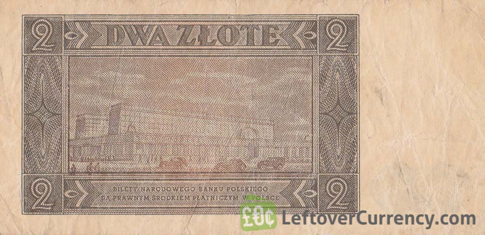 The green coloured banknote of Dwa Zlote has an image of the buildings of the National Bank of Poland on its back side. This two zloty banknote was in use during the Cold War.