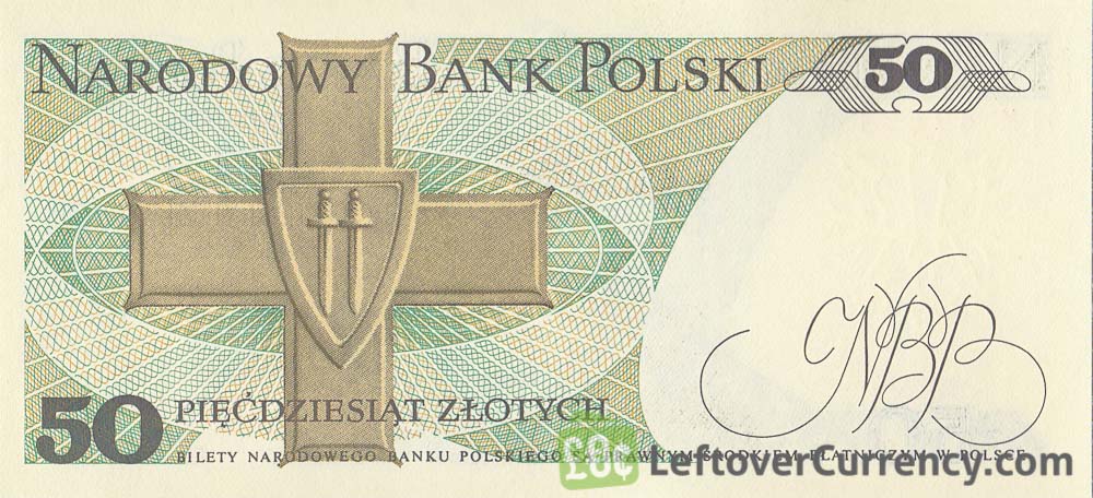 The green coloured banknote of 50 Polish Zlotych has the portrait of General Karol Swierczewski on the front side. The military decoration of the Order of the Cross of Grunwald is featured on the reverse side of Poland’s old fifty zloty banknote, which was in use during the Cold War.