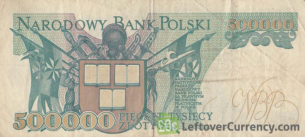 On the banknote of 500,000 old Polish Zloty is the portrait of Polish writer Henryk Sienkiewicz. The back side of the banknote features Sienkiewicz’s trilogy, in the form of three books on a shield along with weaponry and banners.