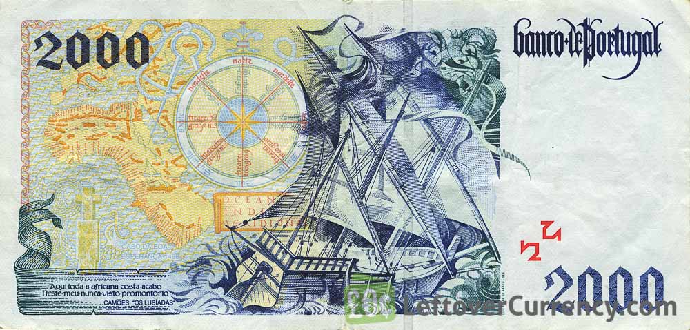 The banknote of 2000 escudos portrays Bartholomeu Dias, Portuguese explorer. The blue green colored paper note contains the words ‘Banco de Portugal’. On the backside of the 2000 PTE bill is an old sailing ship weathering a storm.
