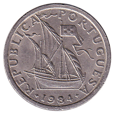 The 2$50 escudos piece was used in Portugal until 1985 after which the denomination was abandoned. On the 2.50 Escudos coin is the image of a sailing ship at sea. The back side shows the Portuguese coat of arms with seven castles and five shields in the shape of a cross.