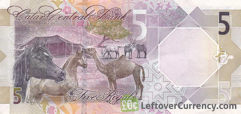 Qatar’s 5 Riyals banknote of the Fifth Series shows a desert scene with Arab horses, oryxes and a camel. In the background is a goat hair tent of the nomads. The Arab language side of the banknote shows a Qatari flag and an ornate door in traditional Islamic design.
