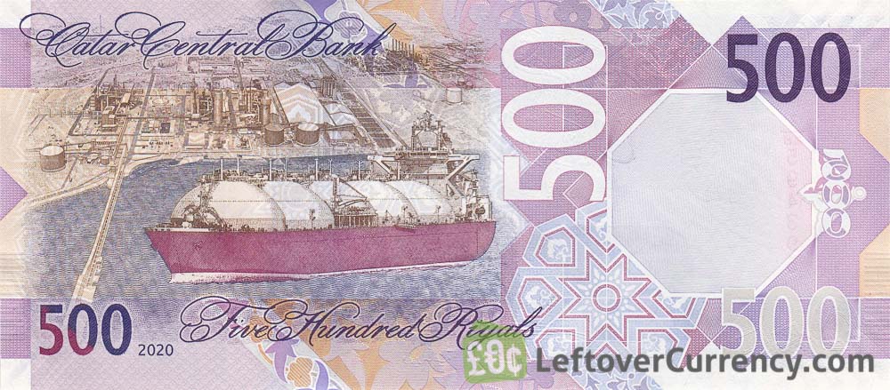 Qatar’s highest value banknote is the 500 Qatari Riyals bill. The 5th Series QR500 note shows a liquefied natural gas (LNG) refinery, Ras Laffan LNG, and a gas carrier ship at the Port of Ras Laffan.