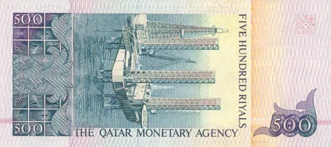 On the 500 riyals banknote of Qatar’s Second Series is an offshore oil drilling platform, referring to the Qatari petroleum industry. Text on the five hundred riyals bill reads “Qatar Monetary Agency”.