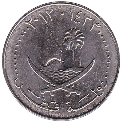 The older type of 25 dirhams coin was issued during the reign of Hamad bin Khalifa. The coins of 25 dirhams are worth 1/4 riyal. Their design features the country’s coat of arms with two crossed swords, to palm trees and a dhow traditional Arab sailing vessel.