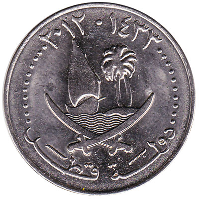 The State of Qatar issued Qatari Riyal coins in 3 different denominations, including this 50 dirhams coin Qatar (Hamad). They are part of the Qatari Riyal dirham coins series. The State of Qatar started issuing these 0.5 Qatari Riyal coins in 1973. They are currently still in circulation.